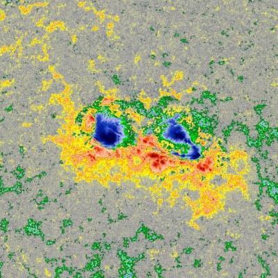 If you look at the way it has changing you will notice the two deep blue or Negative spots, you can see their margins are becoming more defined as they suck up smaller, weaker (green) negative sunspots ring them. The Positive sunspot below those two Negative sunspots are also strengthening and getting a stronger polarity. It looks as if it will be drawn up between the spots, and the margins there are growing ever tighter. Which means it becomes more likely that these twisting magnetic loops will become more intertwined, enhancing the risk they will bump into each other and break away in CMEs. Just with more power than previous CMEs because these have grown in intensive strength. We still have a lot of weaker negative spots bubbling into the positive.