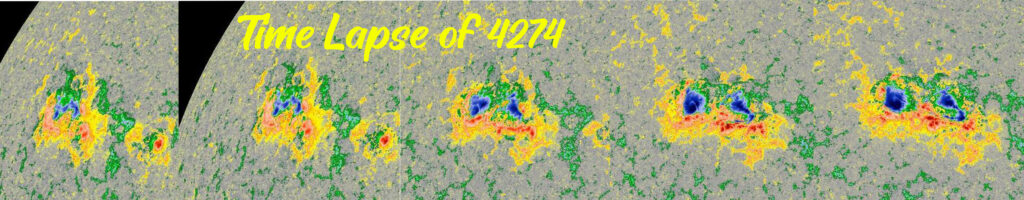To understand what is happening, let’s take a time-lapse of 4274 and see the changes. As this rotated around the sun, you will notice it was primarily a positive spot( red and yellow). As it rotated into view, the Negative polarity spot grew and divided. Getting deeper into dark Blue, which is indicative of that magnetic field line reaching deeper into the sun’s surface and intensifying that magnetic field line. It is slowly pulling in smaller, weaker sunspots, which accounts for the reduction in sunspots numbers. At the same time we see that this has widened by 180 or roughly close to 400 million miles. At this time this sunspot is close to 2580 million miles wide.