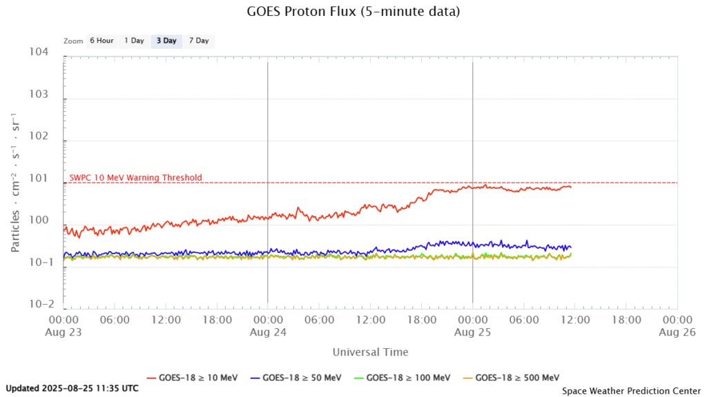 What’s particularly unusual about the recent CMEs is the early surge in high-energy proton flux. Typically, elevated proton levels aren’t observed until sunspots are directly facing Earth. But this group is still on the incoming limb. In fact, it’s the first time in recent memory we’ve seen such high-energy protons originating from that position. As shown in the chart below, solar particle activity is rising, driving a noticeable increase in proton flux. It makes me wonder whether we’ve entered a new phase of the Solar Maximum.